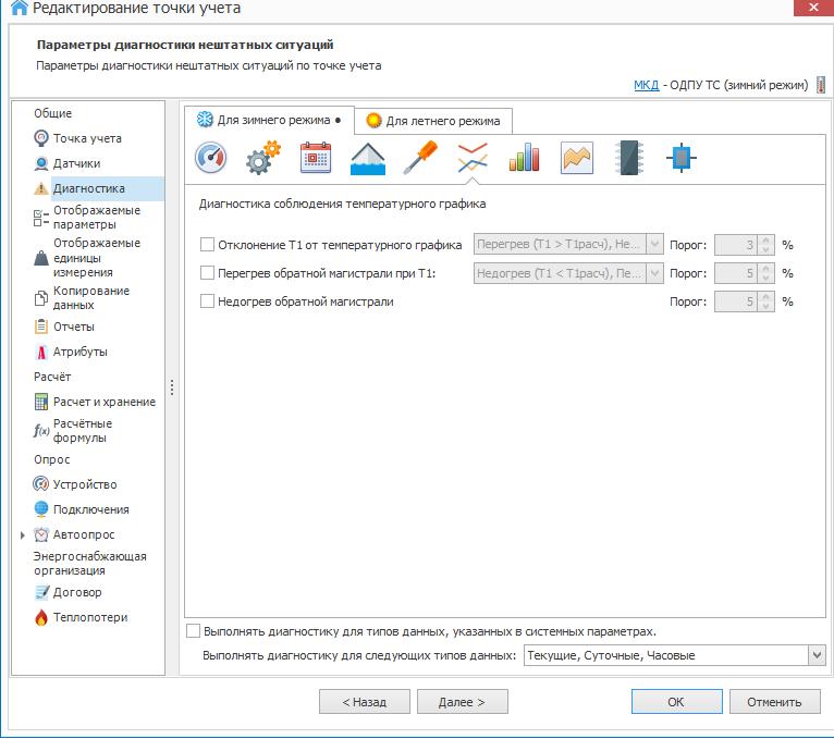 Как понял, диагностика выполняется по Часовым и Суточным. Оставляем. Непонятки вносит внизу Общая запись для ВСЕХ режимов диагностики - Выполнять диагностику для следующих данных (или типовым), где можно выбрать - текущие , часовые или суточные. Отсюда и мое непонимание. Только в инструкции написано, что - диагностируются для Часовые и Суточные для данного режима.