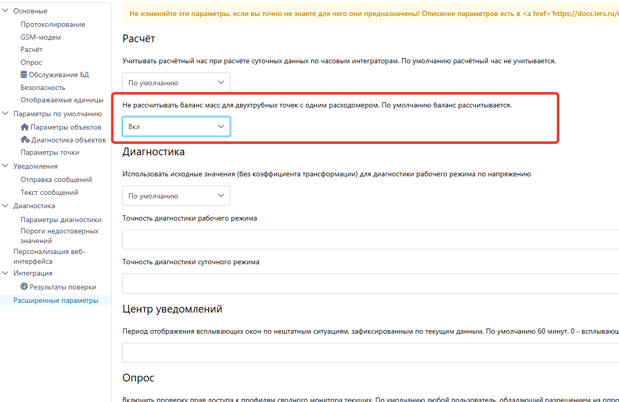Установите параметр “Не рассчитывать баланс масс для двухтрубных точек с одним расходомером. По умолчанию баланс рассчитывается.“ в состояние “Вкл”.