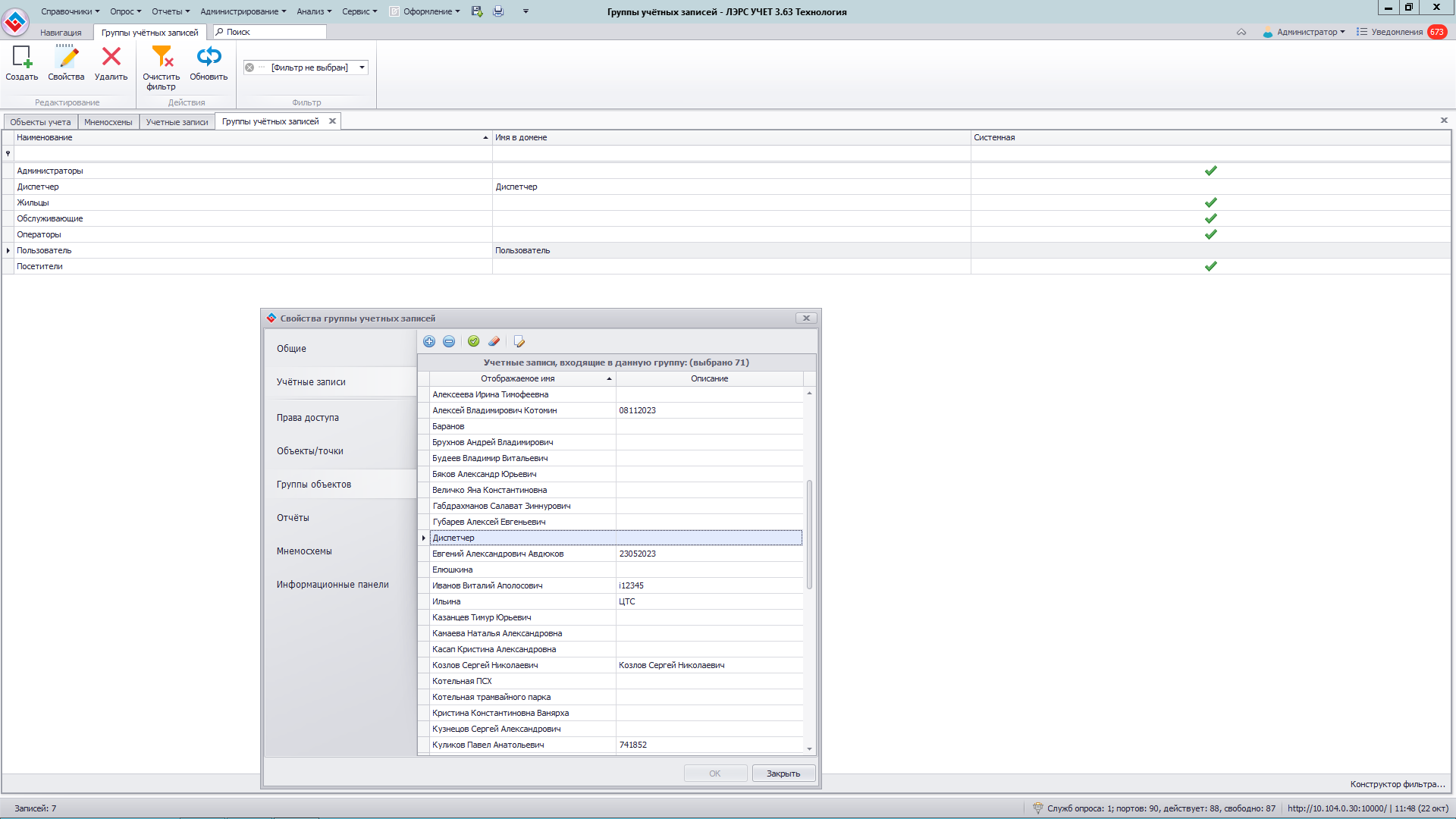 В какие группы включена рассматриваемая учетная запись? Какие разрешения мнемосхем по каждой из этих групп?