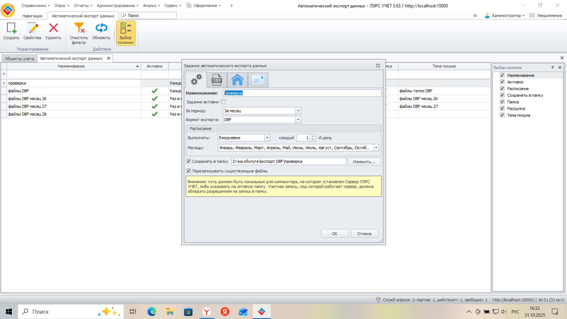 Здравствуйте! Как настроить время выполнения экспорта данных? При создании задания автоматического экспорта данных можно настроить в расписании только пункты “Выполнять“ (ежедневно, ежемесячно, определенные дни), “каждый“ (1-й, 2-й и т.д. дни) и “месяцы“. А время почему то автоматически подставляется с 06:00 по 20:59, как изменить время?