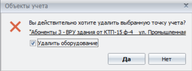 в случае удаления точки учёта из объектов учёта, при установке галочки “Удалить оборудование” - оборудование из списка “Оборудование” не удаляется