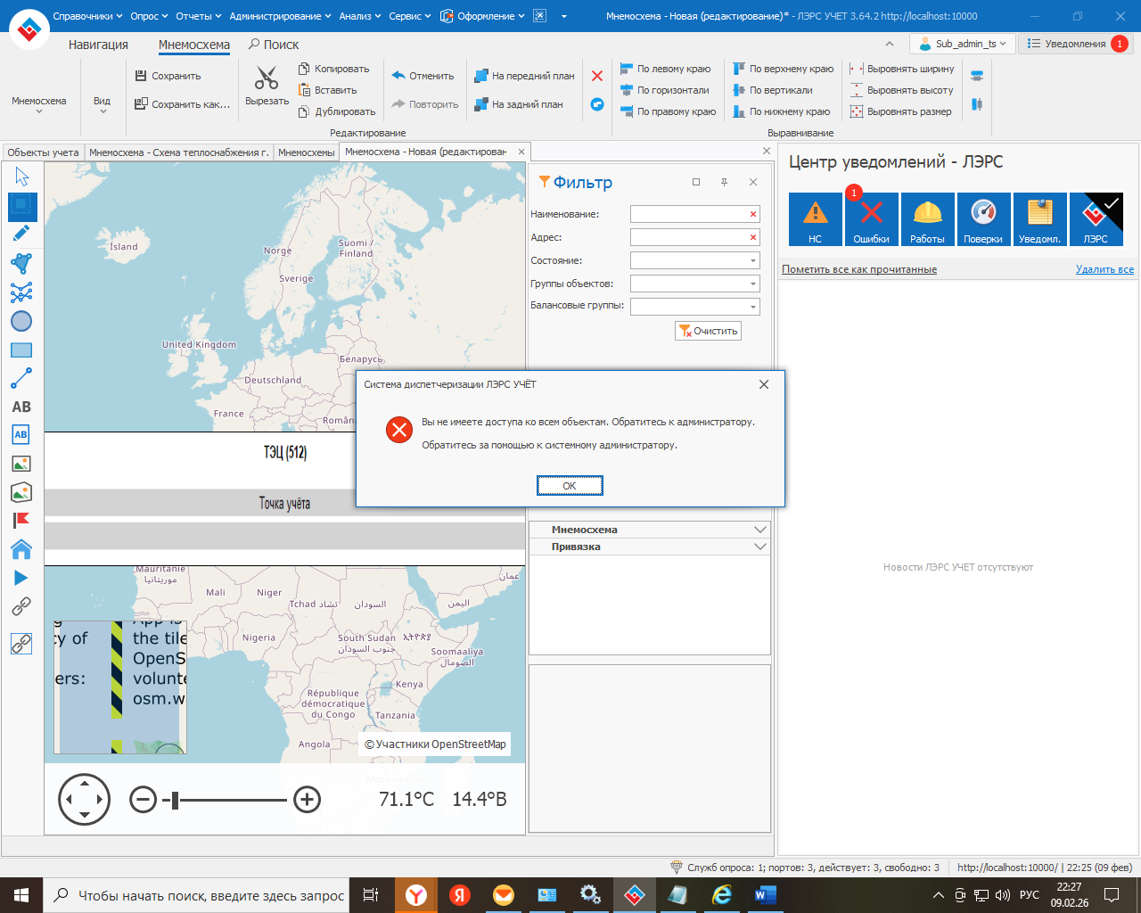 Пользователь без прав администратора не может редактировать и создавать мнемосхемы в своих доступных объектах, так как система требует доступа ко всем объектам и выдает ошибку.