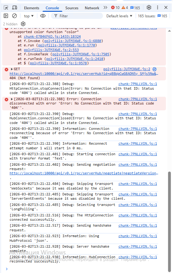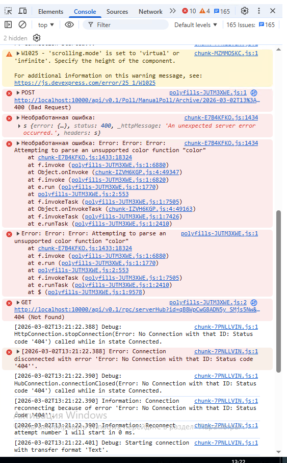 У нас ситуация воспроизводится но только частично. В частности происходит зависание страницы, но при этом какой либо необработанной ошибки не возникает и содержание консоли несколько отличается от вашего.
