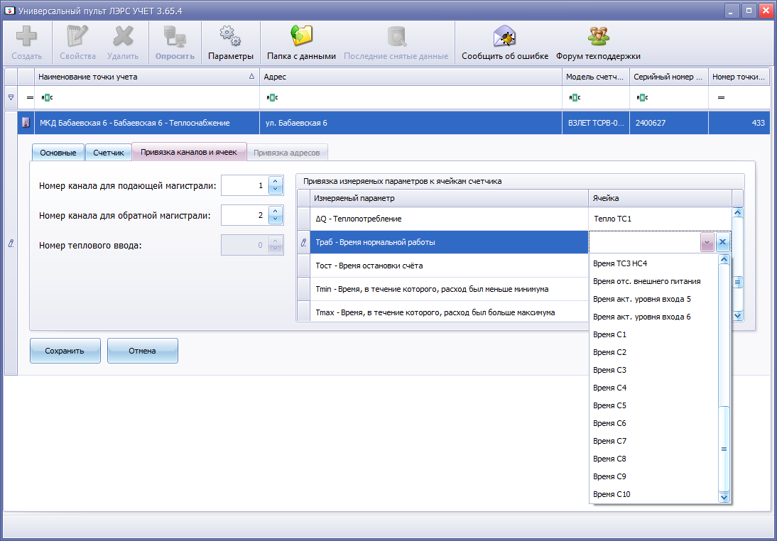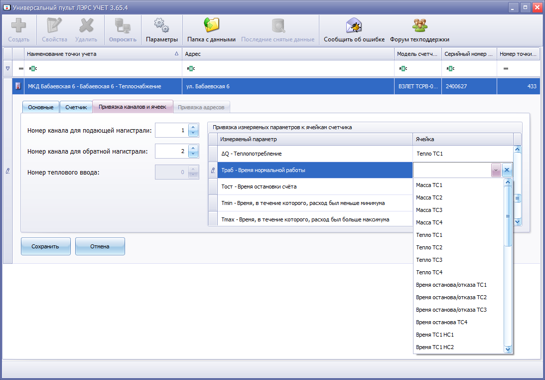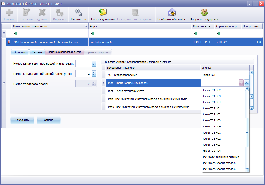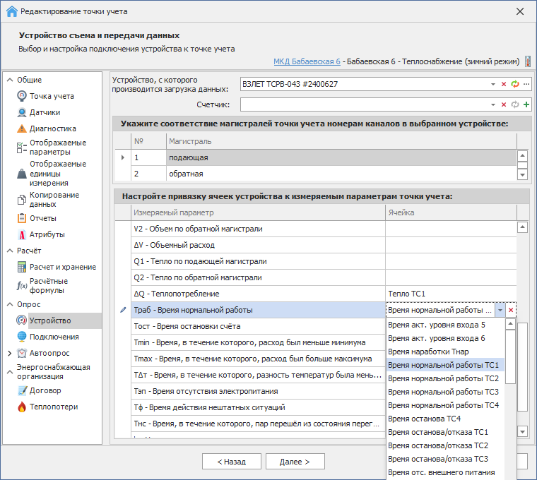При экспорте этой точки в универсальный пульт привязка ячейки Траб к “Время нормальной работы ТС1” пропадает. И нет возможности выбрать её вручную: