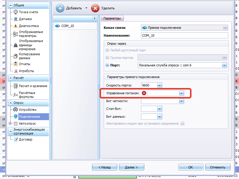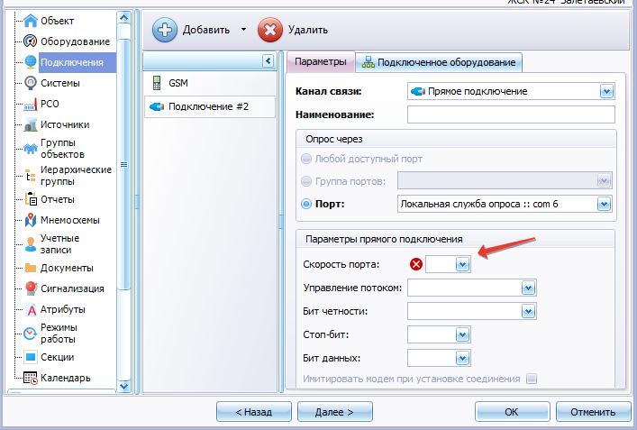 Создал точку, добавил устройство, перешел в “Подключения”, нажал кнопку “добавить”, “канал связи” - “Прямое подключение”, выбрал порт и в параметрах подключения нет возможности выбрать “управление потоком” - “отсутствует”, а когда захожу в свойства “Объекта” и пробую настроить там “Подключения”, то не выбираются скорости в выпадающем списке, точнее там пусто. Ну и соответственно не возможно сохранить.