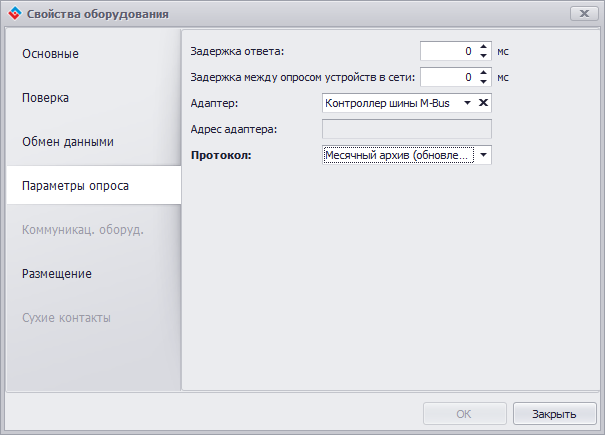 Для опроса вам потребуется выбрать адаптер в свойствах оборудования и выбрать необходимый протокол для опроса (в вашем случае “Месячный архив (обновленный протокол)”)