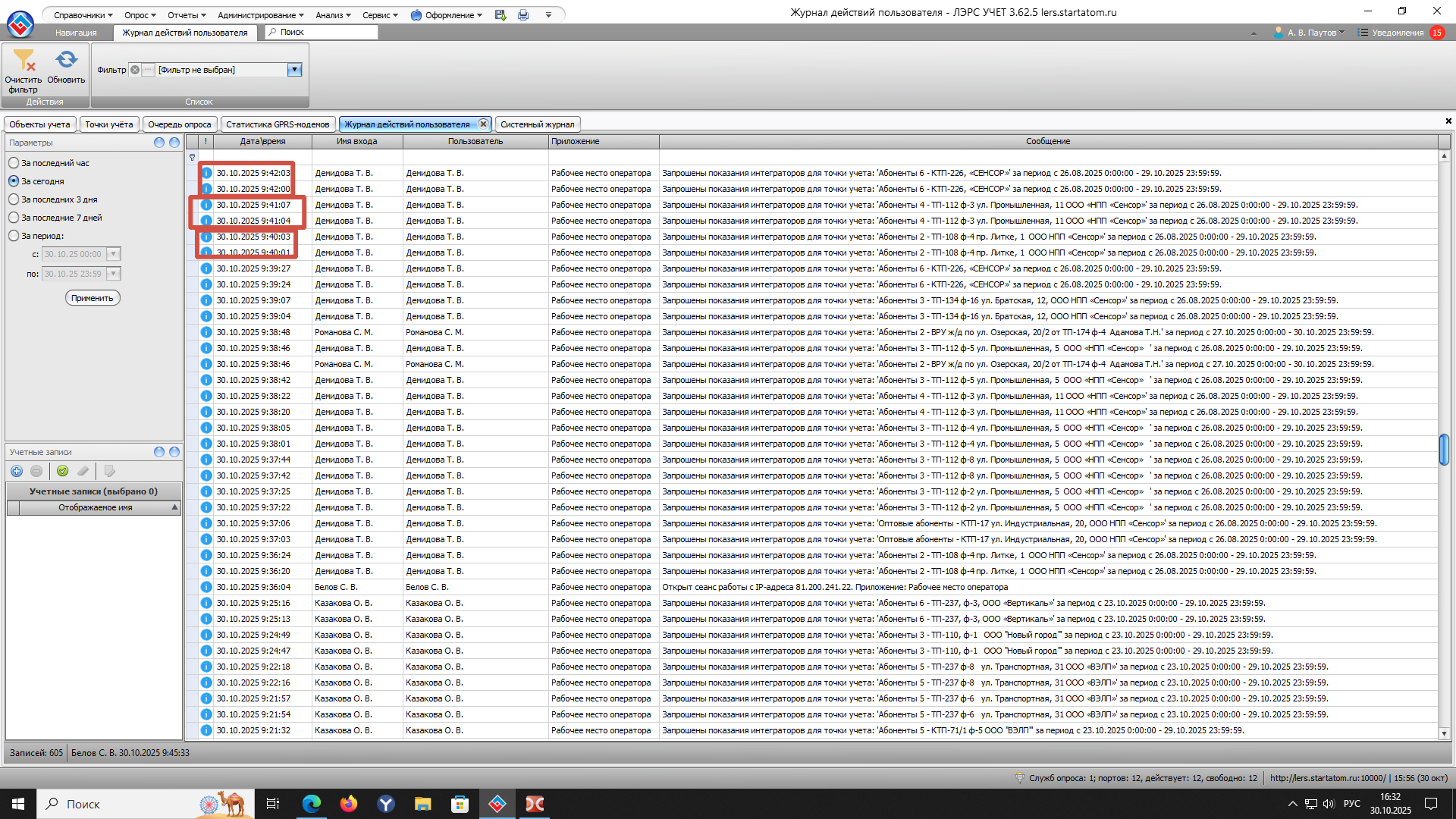 Для проверки, пожалуйста, полностью закройте Рабочее место оператора, запустите его заново и откройте системный журнал, запомнив время открытия. После этого отключитесь от Сервера (круглая кнопка с логотипом в левом верхнем углу → Отключиться), подключиться заново откройте системный журнал, запомнив время. Откройте журнал действий пользователя и проверьте продублируется ли запись о последнем запросе системного журнала.