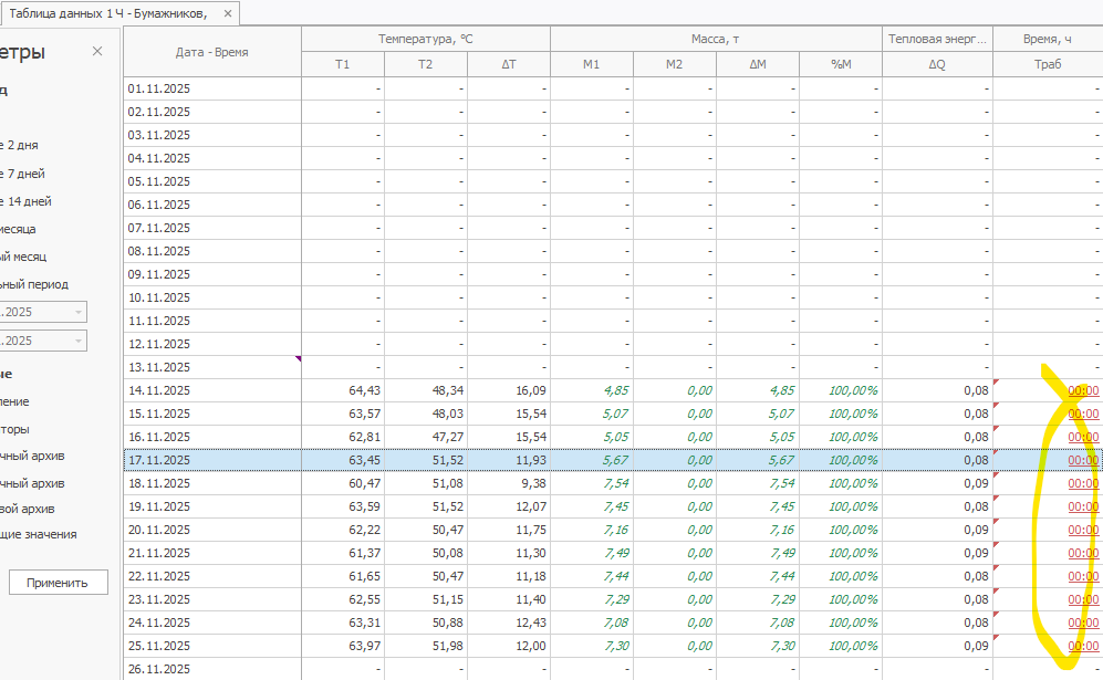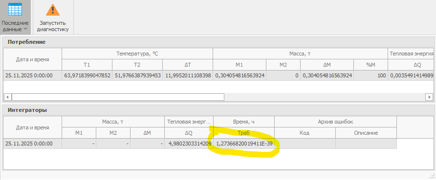 На скриншотах видно как время наработки, пришедшее со счетчика, декодируется как близкое к нулю значение.