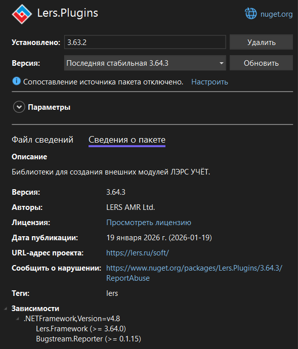 При попытке обновить nuget пакет Lers.Plugins до версии 3.64.x появляется ошибка