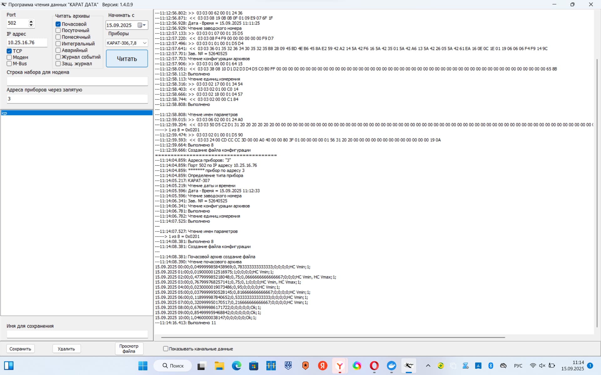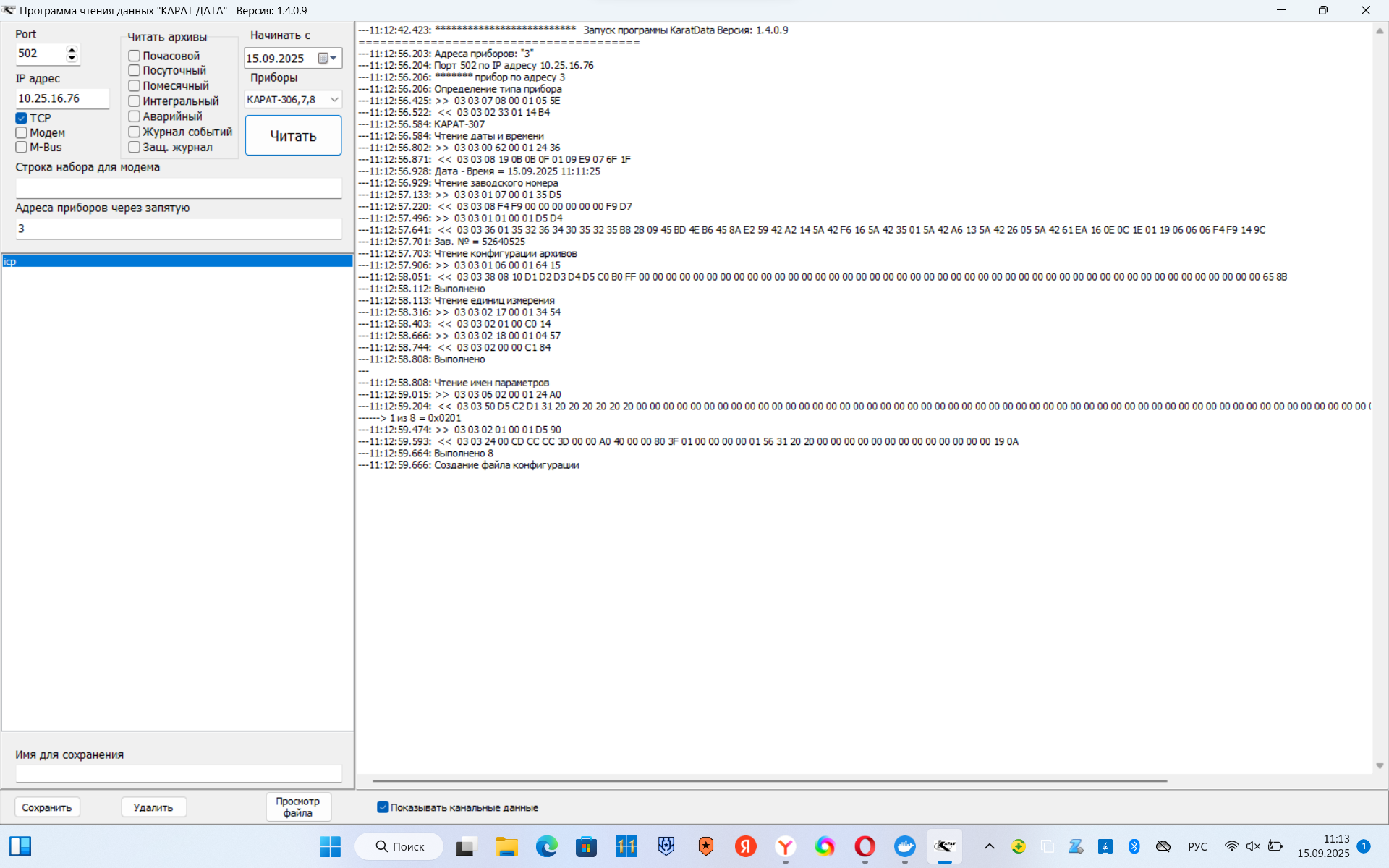 Немногим ранее вы утверждали, что опрашиваете рассматриваемый прибор по MODBUS TCP в программе KaratData, тогда как сейчас пишите, что опрашиваете уже по MODBUS RTU. Уточните, пожалуйста, с чем связана такая разница? То есть ранее вы опрашивали в программе KaratData все такие по MODBUS RTU, а не по MODBUS TCP?