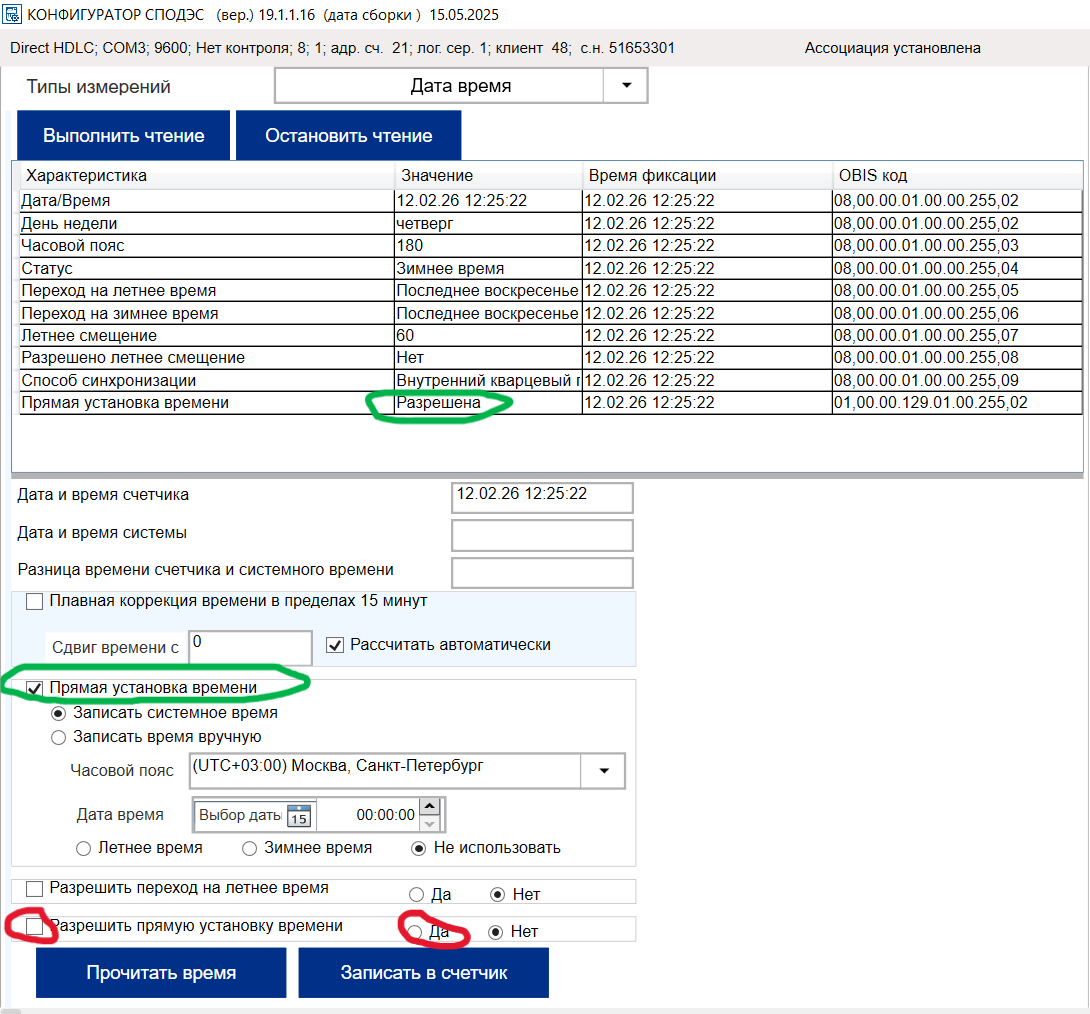 "Ставить флаг «Разрешить прямую установку времени» не обязательно, так как прямая установка времени в счётчике уже разрешена.