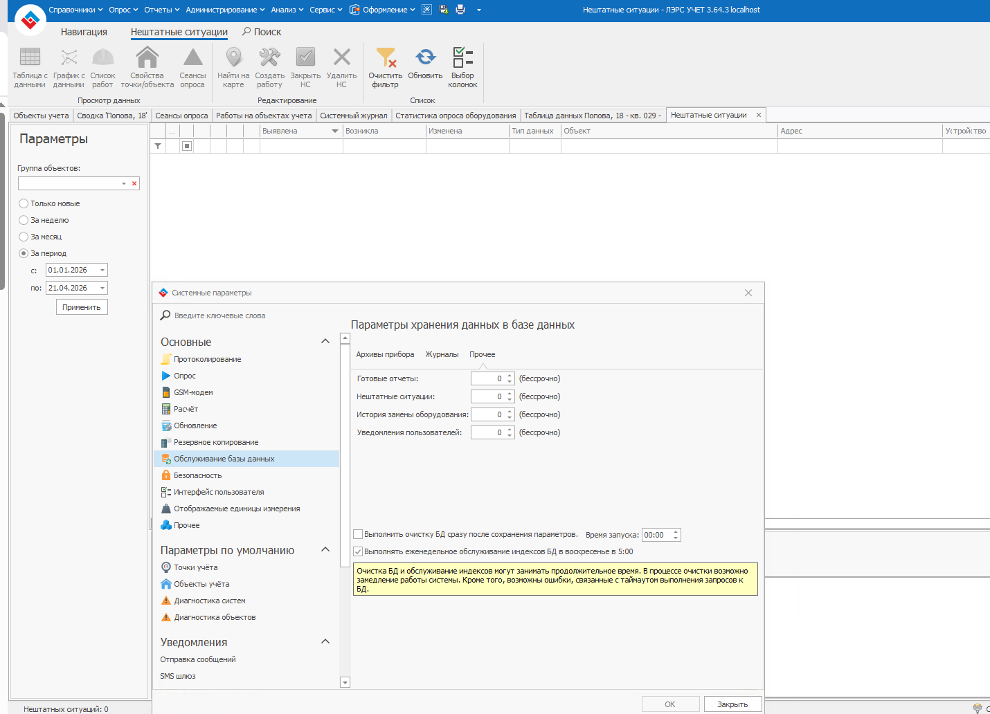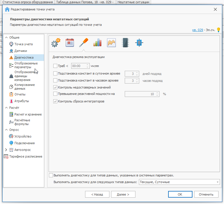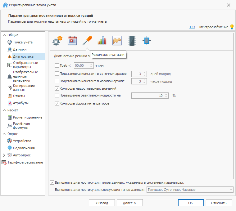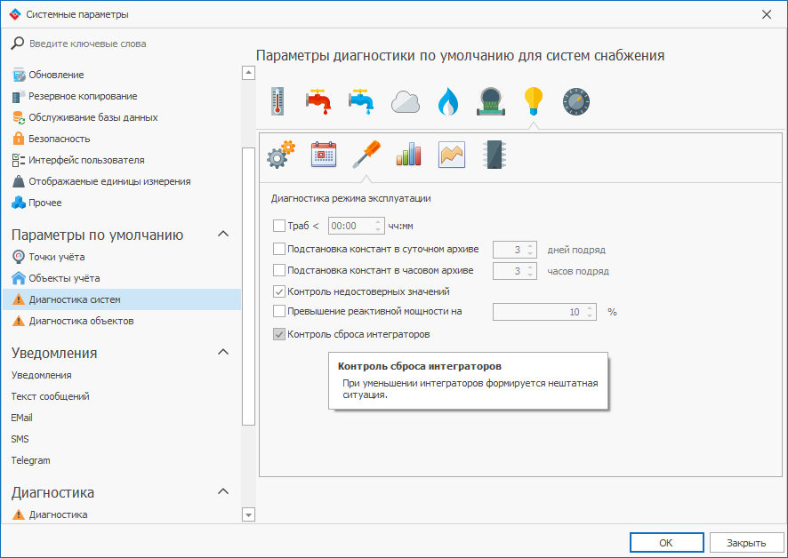 Почему “Параметры по умолчанию” влияют на диагностику НС систем, настроенных не по умолчанию? Я логически предполагаю, что “Параметры по умолчанию” должны лишь задавать параметры для вновь создаваемых точек учёта. У вас по-другому логика работает?