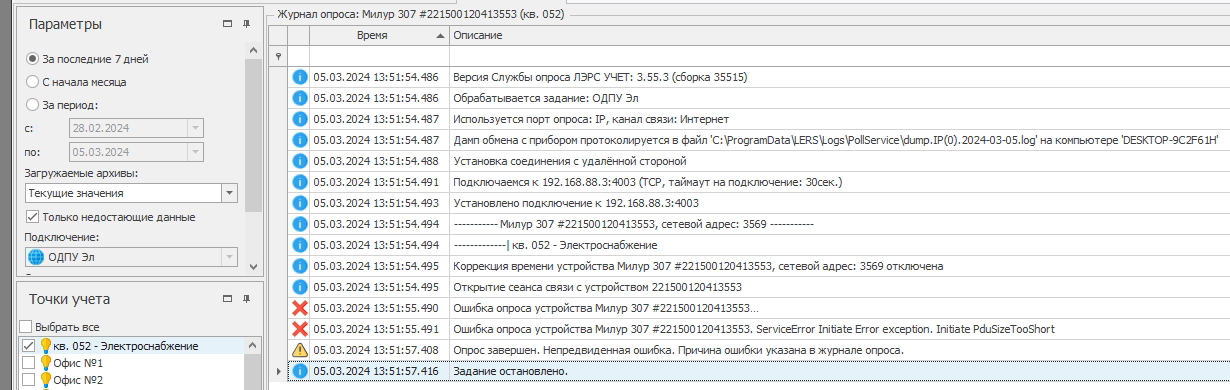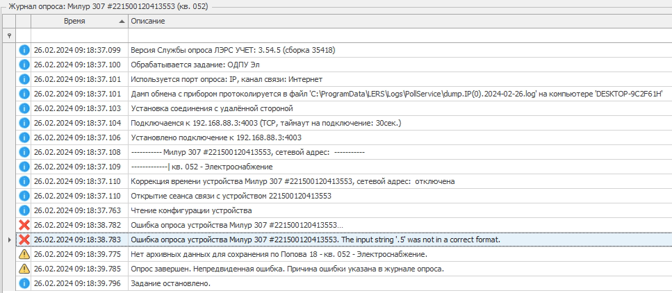 Пожалуйста, обновитесь до текущей версии 3.55.3 и повторите опрос в ней. Если ситуация повторится, приложите новые журнал опроса и дамп обмена из текущей версии. Также в этом случае приложите фото шильдика прибора и фото его паспорта.