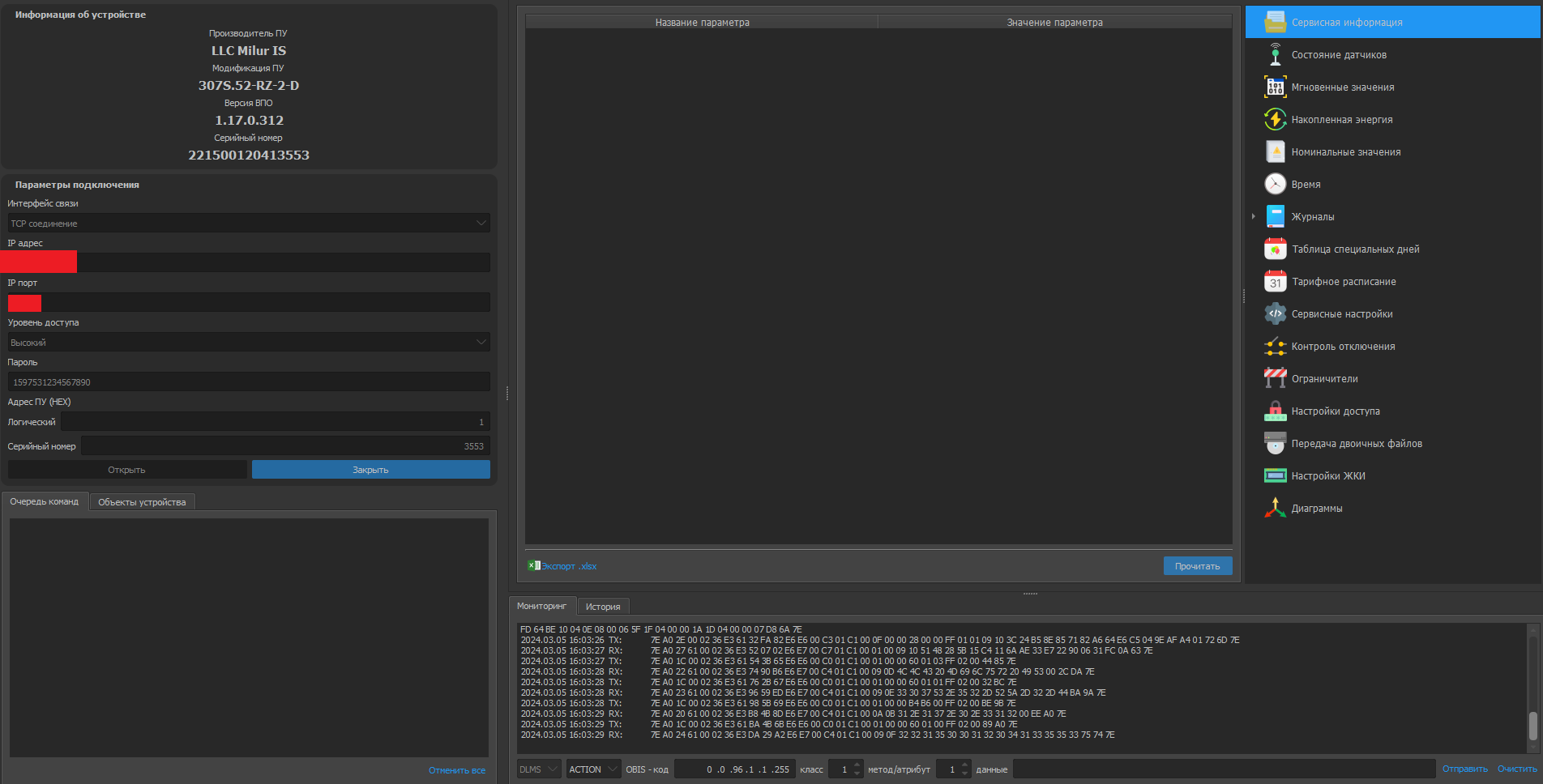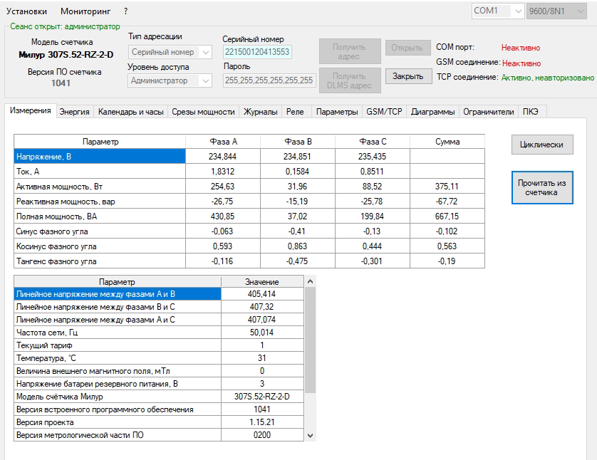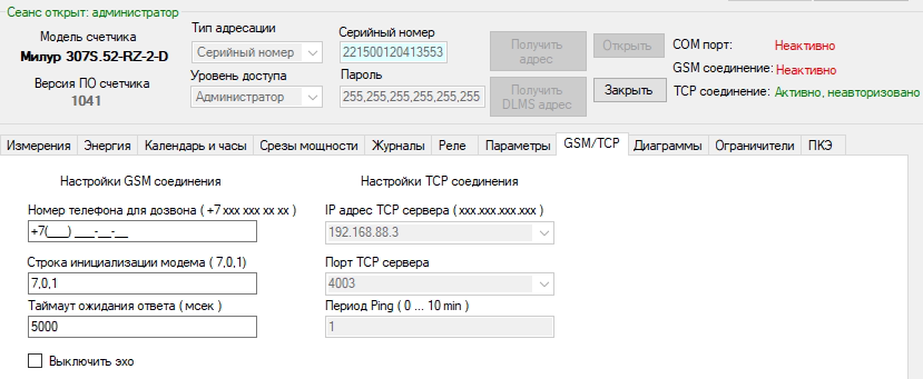Теперь опрос произвожу через другой конфигуратор Милура для счетчиков сподэс. Пароль для высокого уровня доступа там: 1597531234567890