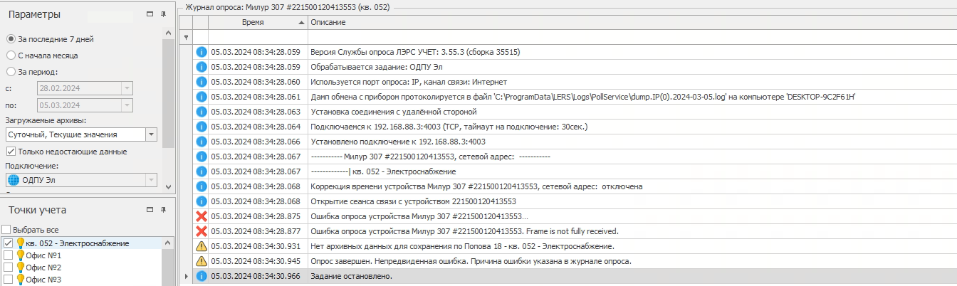 В частности при опросе суточных данных некорректно определяется период их наличия в приборе, в результате чего не удается опросить существующие в приборе данные, которые находятся вне неправильно определенного периода их наличия. А при опросе текущих возникает непредвиденная ошибка, хотя считанные текущие успешно сохраняются.