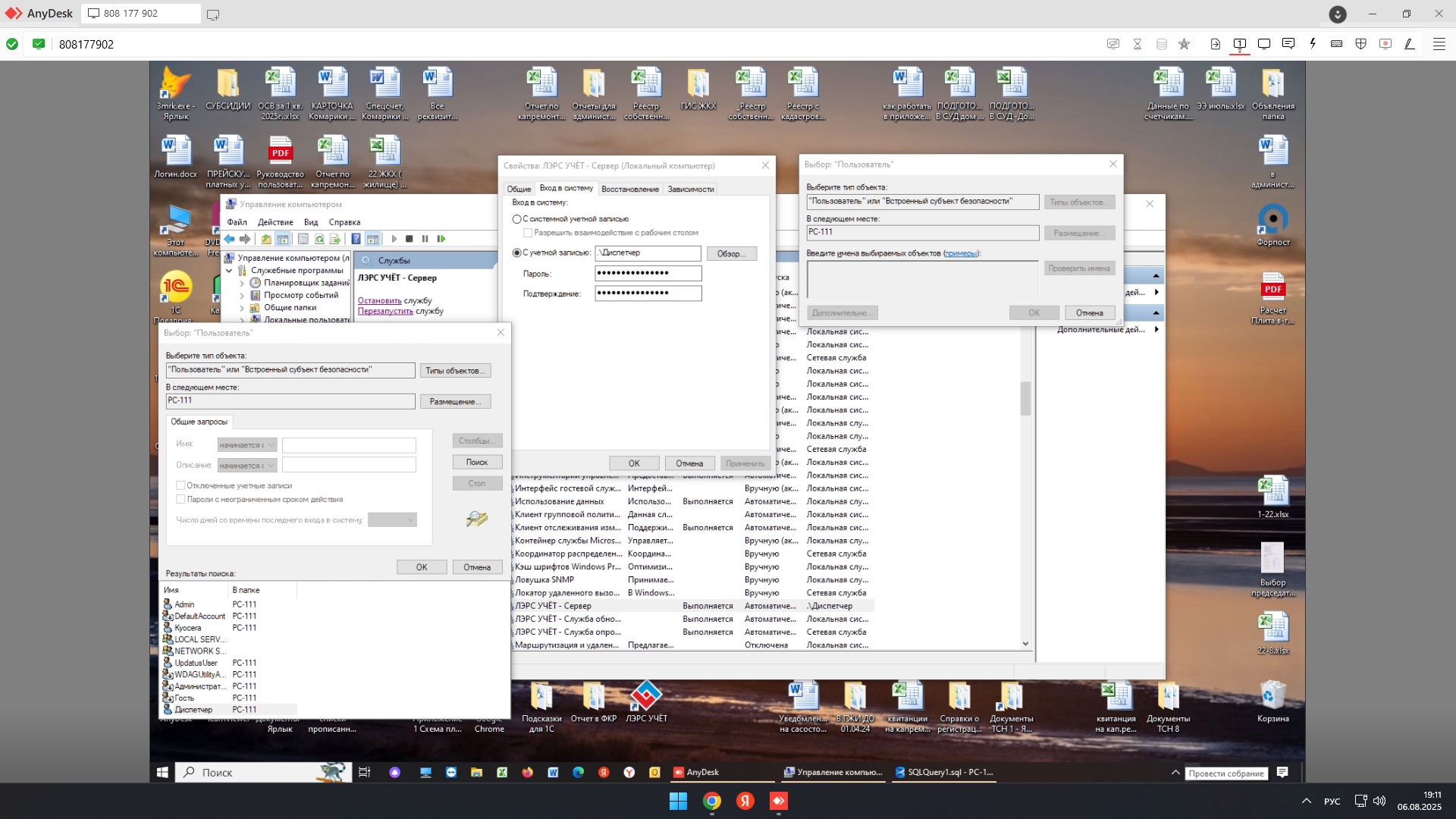 Запустите оснастку Управление компьютером. Раскройте раздел Службы и приложения и выберите пункт Службы. Найдите службу ЛЭРС УЧЁТ - Служба сервера. Откройте свойства службы и выберите вкладку Вход в систему. Посмотрите под какой учётной записью запускается Служба сервера.