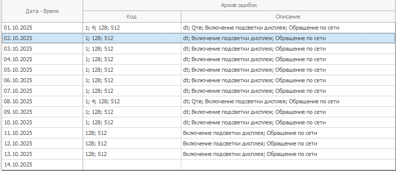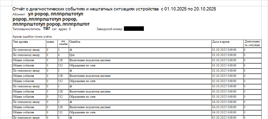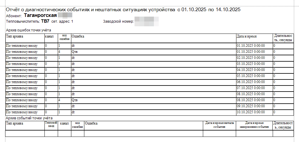 А в отчёте их нет, есть только ошибки с кодом 1 и 4, а событий нет и в таблице ниже. Пробовал искать где они могут быть - не нашёл. Подскажите пожалуйста как вывести в отчёт все события и ошибки из таблицы данных по точке учёта.