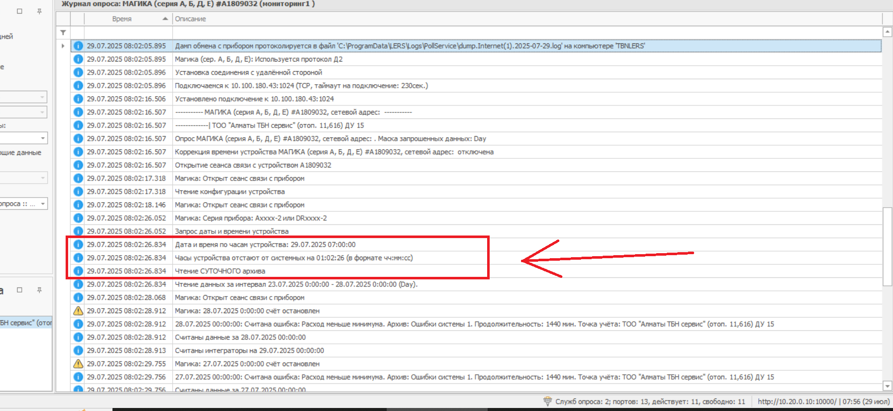 Отмечу, что в протоколе “Шлюз RS232-RS232” подобный запрос предусмотрен. Если вам важно точное время прибора при его опросе, вы можете настроить прибор на опрос по данному протоколу, после чего настроить его опрос по данному протоколу в ЛЭРС УЧЕТ.