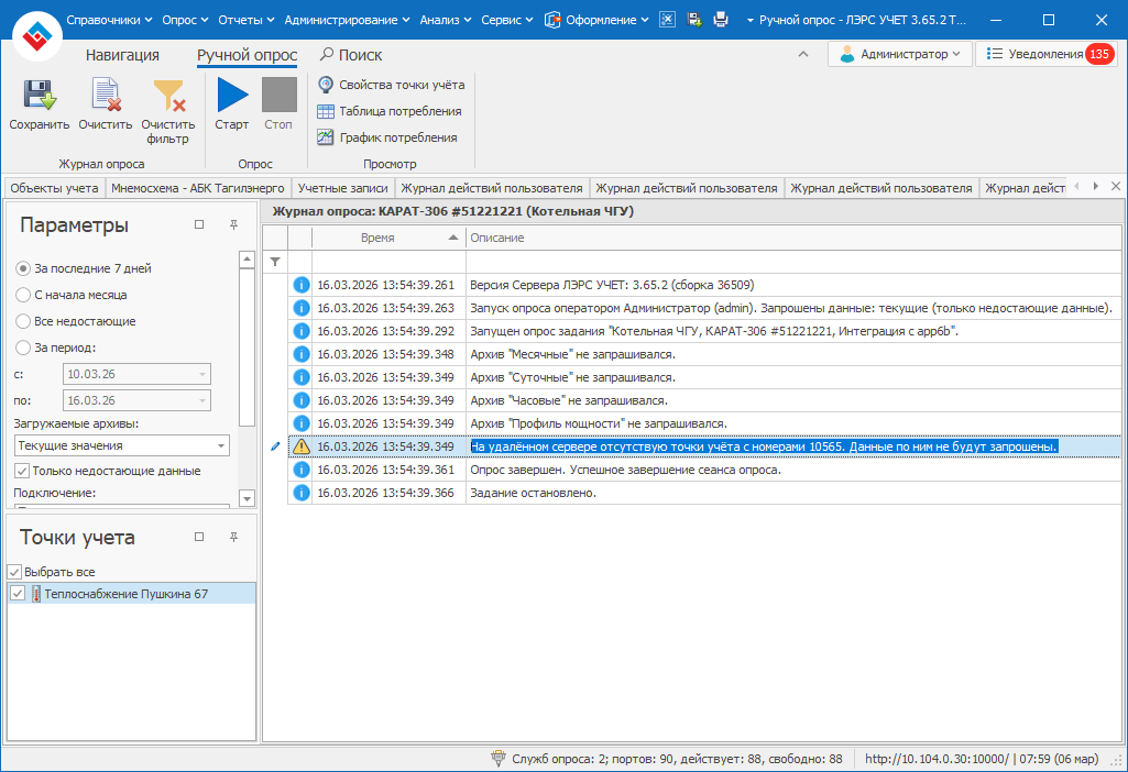 Опрос на втором сервере ЛЭРС выдает: “На удалённом сервере отсутствую точки учёта с номерами 10565. Данные по ним не будут запрошены.”
