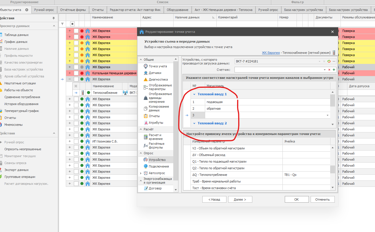 Суть в следующем: на тепловычислителях, в частности ВКТ-7 и ТВ7, во ввод ТВ1 подключена подпитка в Канал 3. Подпитка идет из обратного трубопровода РСО, и имеет только расходомер, который пломбируется. Из этого следует, что необходимо считывать эти параметры подпитки, которые обозначить как М3 в параметрах потребления. А также в свойствах точки учёта был датчик (этот расходомер), который позже отображался в актах.