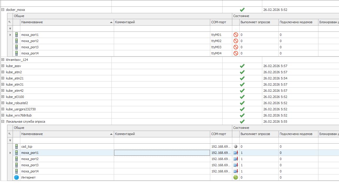 Это разные порты опроса. На службе опроса docker_moxa сейчас действительно запрещены к использованию все порты опроса, все csd модемы сейчас работают на локальной службе опроса. Одинаковые названия у них т.к. физически это одни и те же модемы, просто на локальной службе они подключены через прозрачный преобразователь