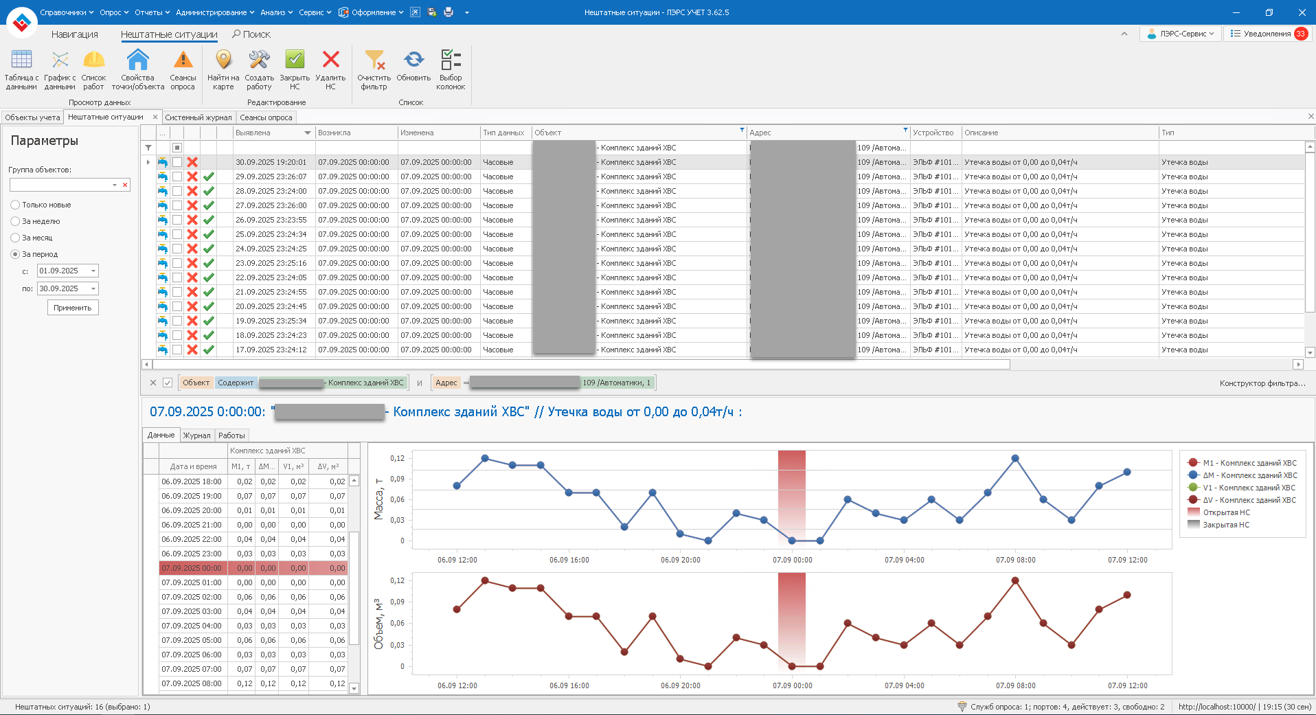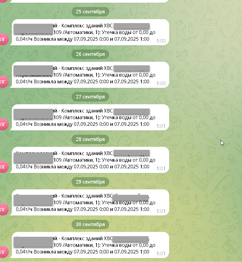 Возникла непонятная ситуация с НС об утечке воды. Она произошла в начале месяца, пользователь регулярно закрывает её, но она снова фиксируется каждый день. Переопроса данных за 7 сентября точно не было, диагностику повторно не запускают.