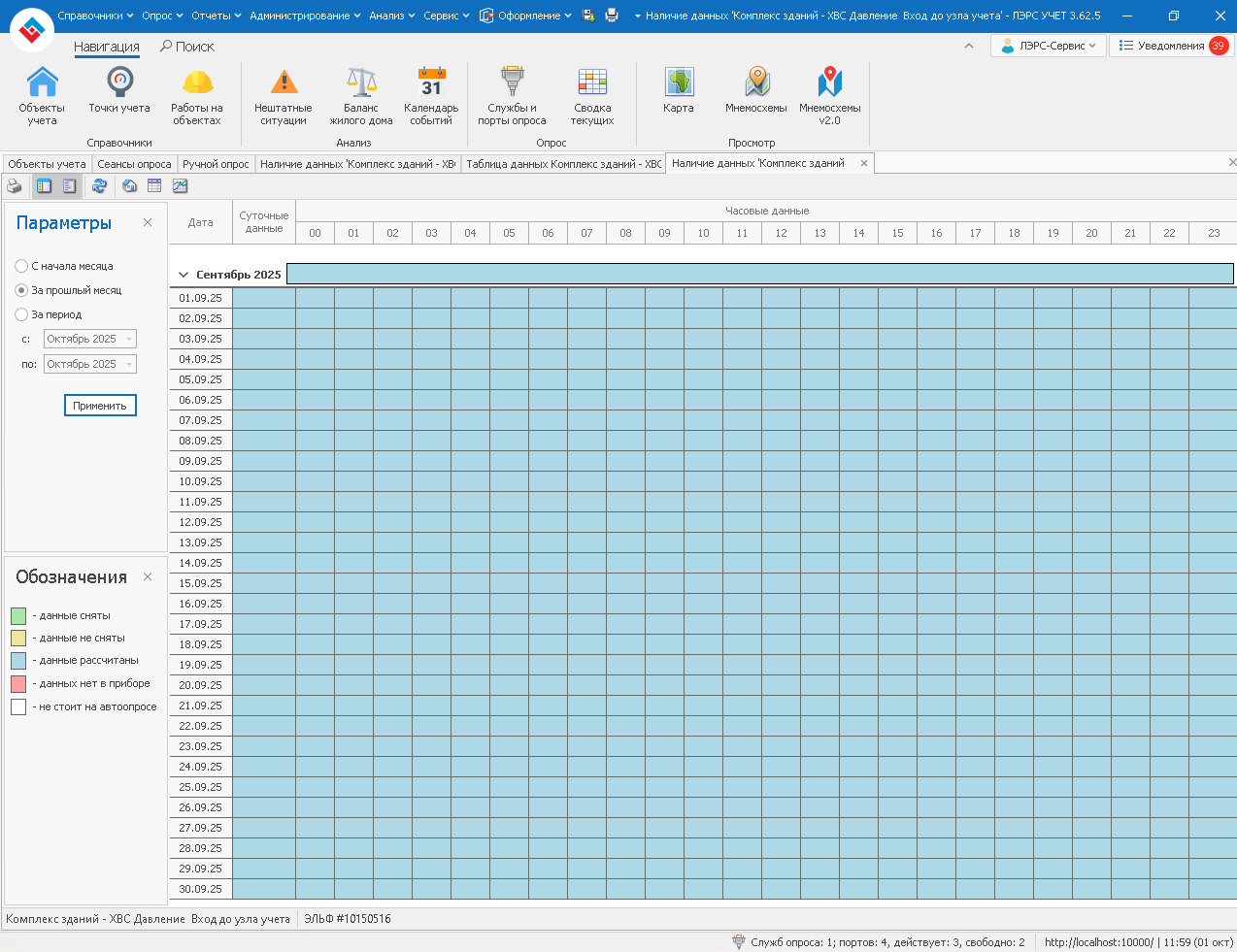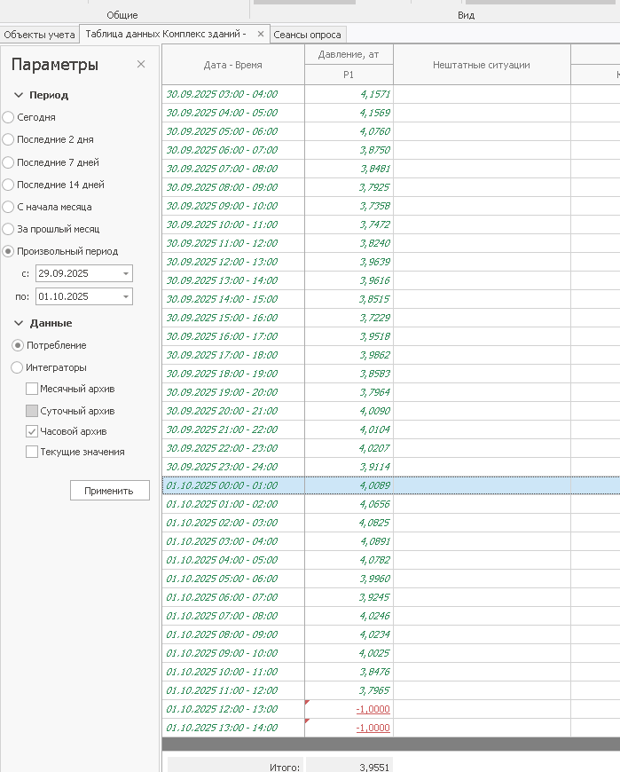 Вроде да. Но говорю «вроде», потому что в этих точках измеряется только давление. Когда возникает такая странная ситуация с запросом, в часовом архиве давление становится равным «-1». По мере увеличения интервала опроса текущие данные вообще перестают запрашиваться. Собственно, именно значение давления «-1» и привлекло внимание. При этом в суточном архиве данные по давлению отображаются корректно.