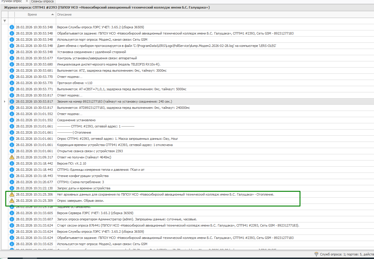 Также заметила, что при опросе по расписанию узел часто не опрашивается — как будто не происходит дозвона. При этом при ручном запуске полного опроса (без галочки «только недостающие») данные считываются.