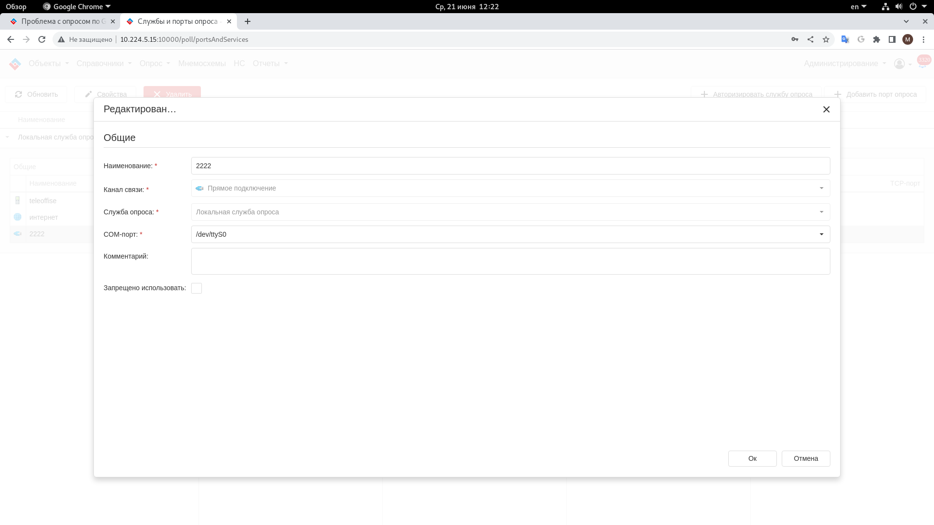 - Служба опроса не слушает порт 10000. Это порт Сервера ЛЭРС УЧЕТ. Поэтому данный порт пробрасывать не нужно. Вам нужно пробросить только COM-порт, одновременно убрав проброс из контейнера Сервера.