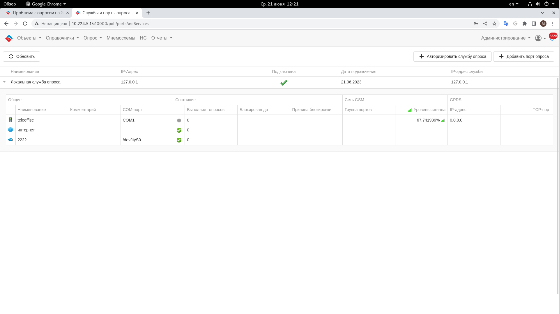Попробуйте создать отдельный контейнер docker только со Службой опроса (образ “lersamr/pollservice:latest”), направив на нее рассматриваемый COM-порт с модемом в файле docker, настроить ее на подключение к вашему Серверу с перенесенной БД по IP-адресу интерфейса (фигурирует на ваших скриншотах браузера с Веб-интерфейсом) либо по токену и завести ее в нем, завести для нее данный COM-порт и произвести опрос по GSM через данную Службу опроса. Сообщите будет ли возникать описываемая ситуация при этом.