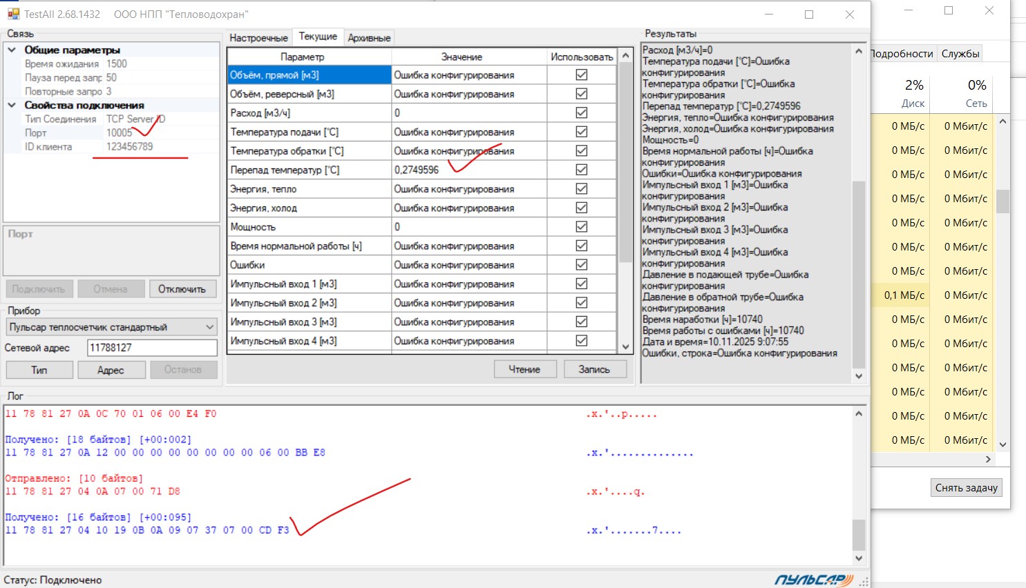 Локально выполняли опрос одного прибора — теплосчетчика Пульсар, связь и обмен данными работали корректно.