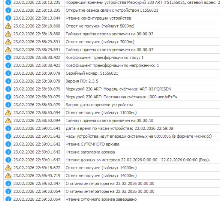 Если перевести в режим ТЕСТ, то подключение и считывание архивов успешное, если перевести из ТЕСТ в рабочий режим то снова: ответ не получен (таймаут 2600).