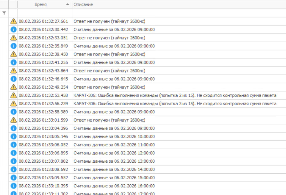 К карату-910 подключено несколько счетчиков + карат-306. Водосчетчики подключены к карат-306, электросчетчики напрямую к карат-910. Данные с электросчетчиков приходят, с водосчетчиков нет. Расход есть.