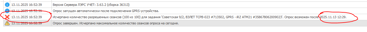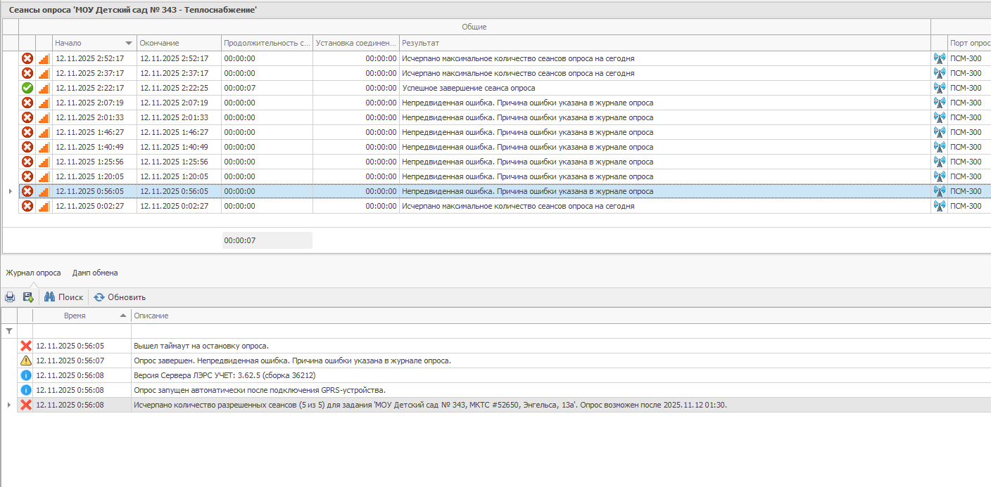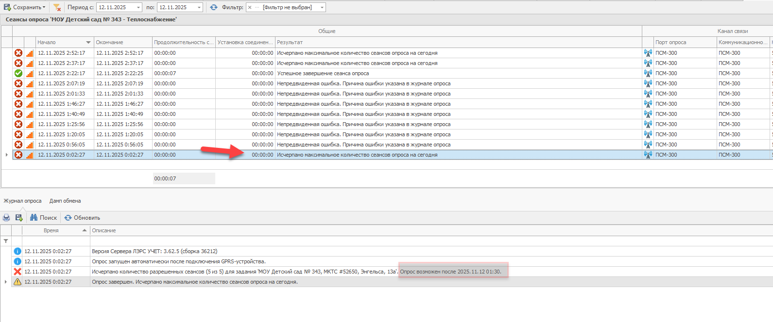 Вторая странность — надпись «Опрос возможен после 2025.11.12 01:30». Причём тут 1:30, если в настройках предусмотрено 5 сеансов в сутки? И это первый сеанс.