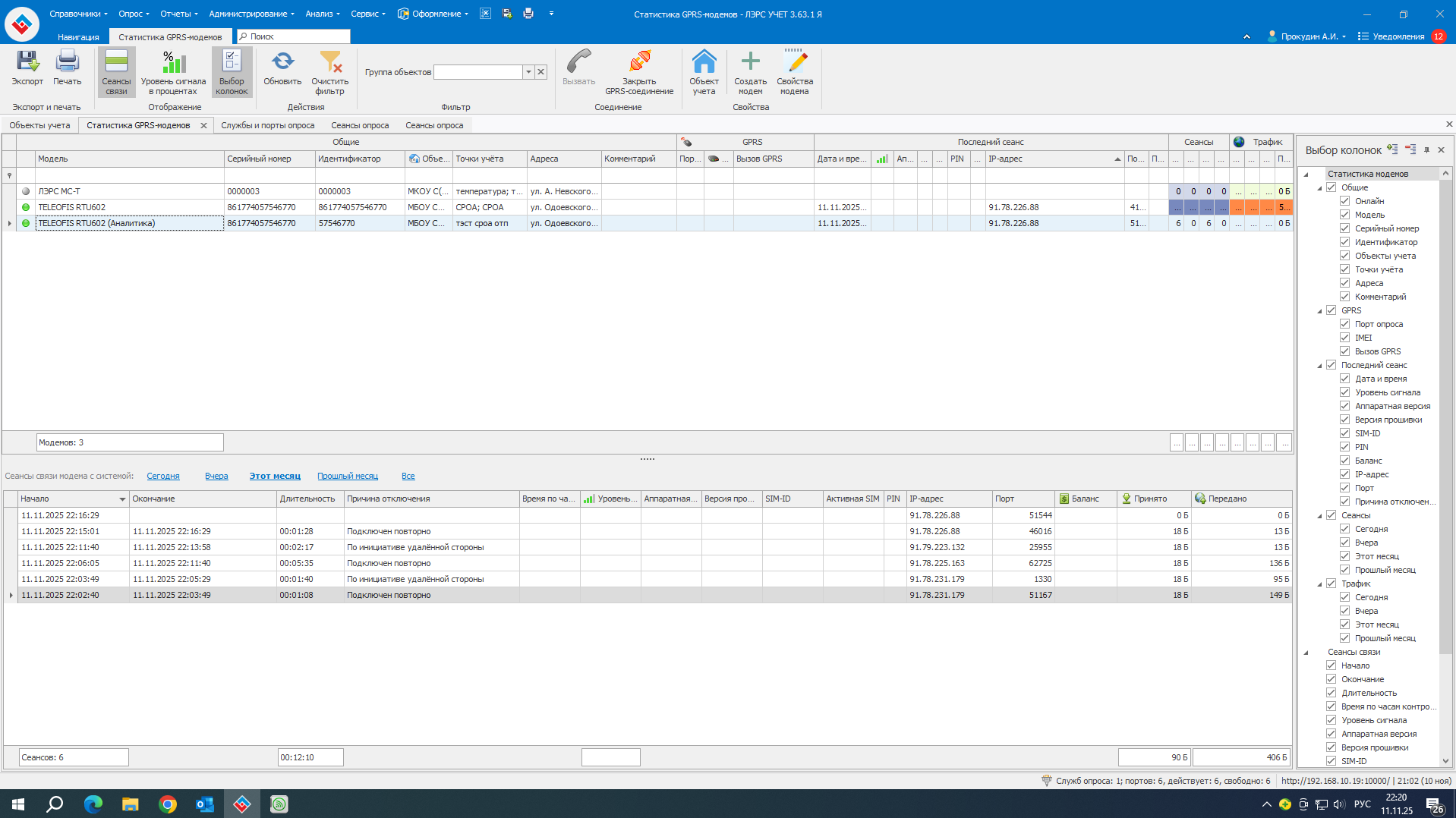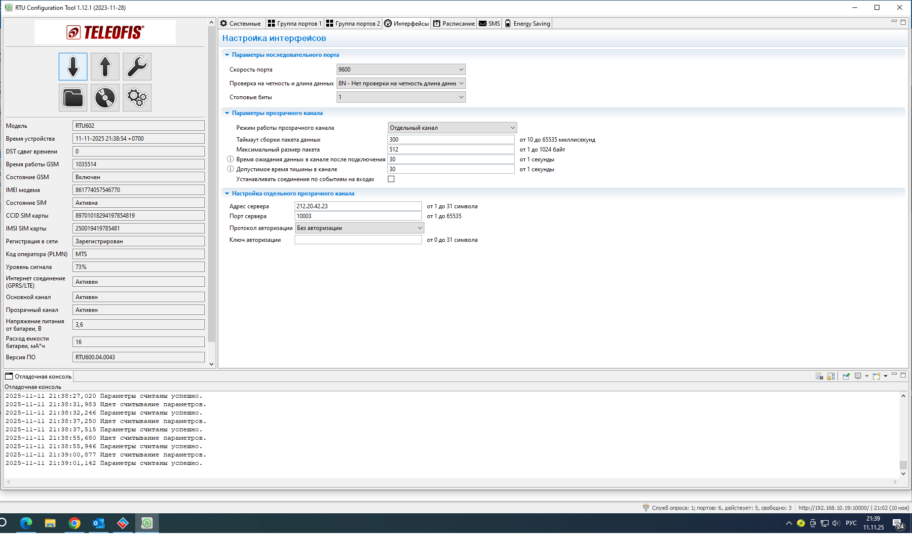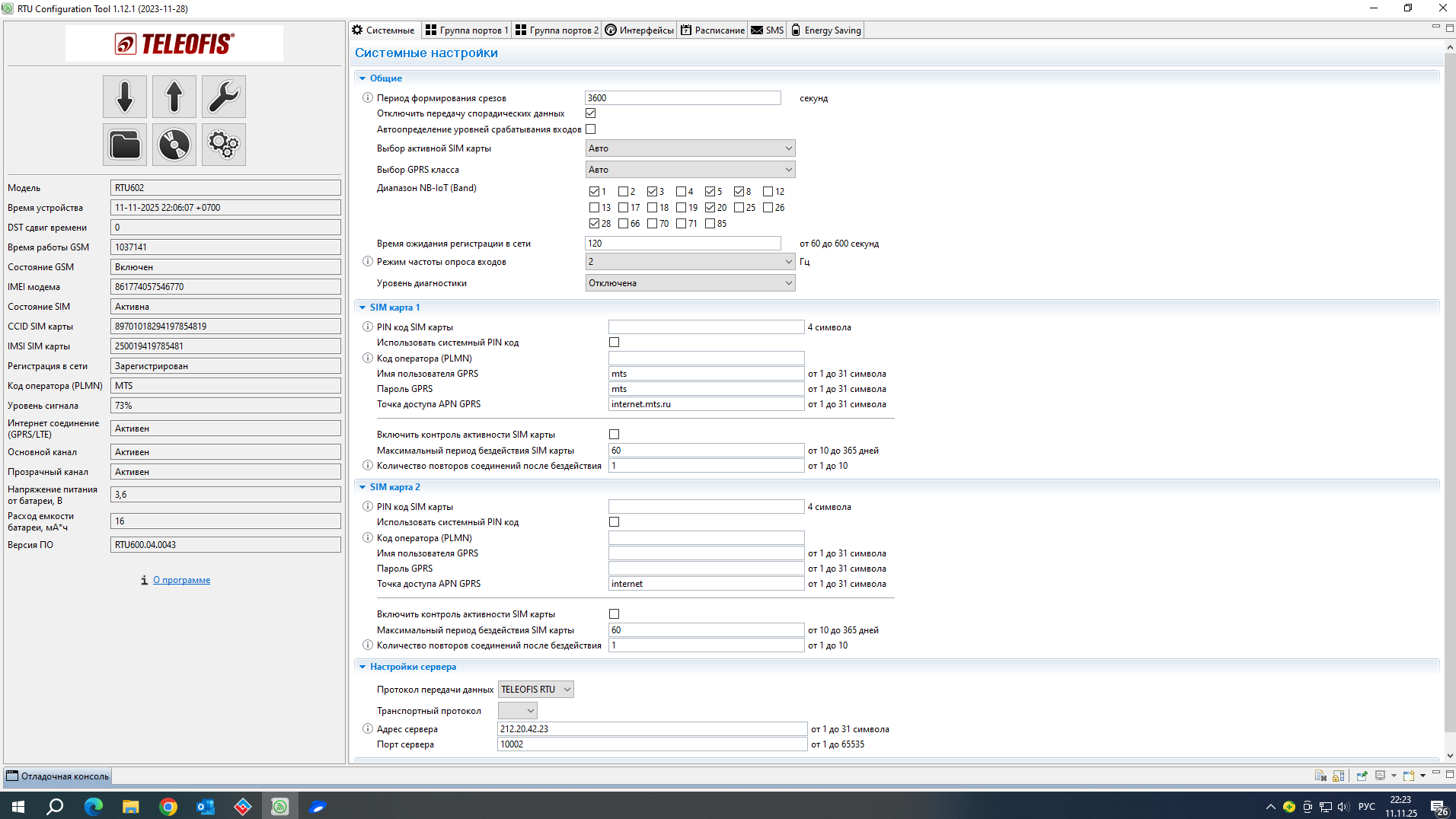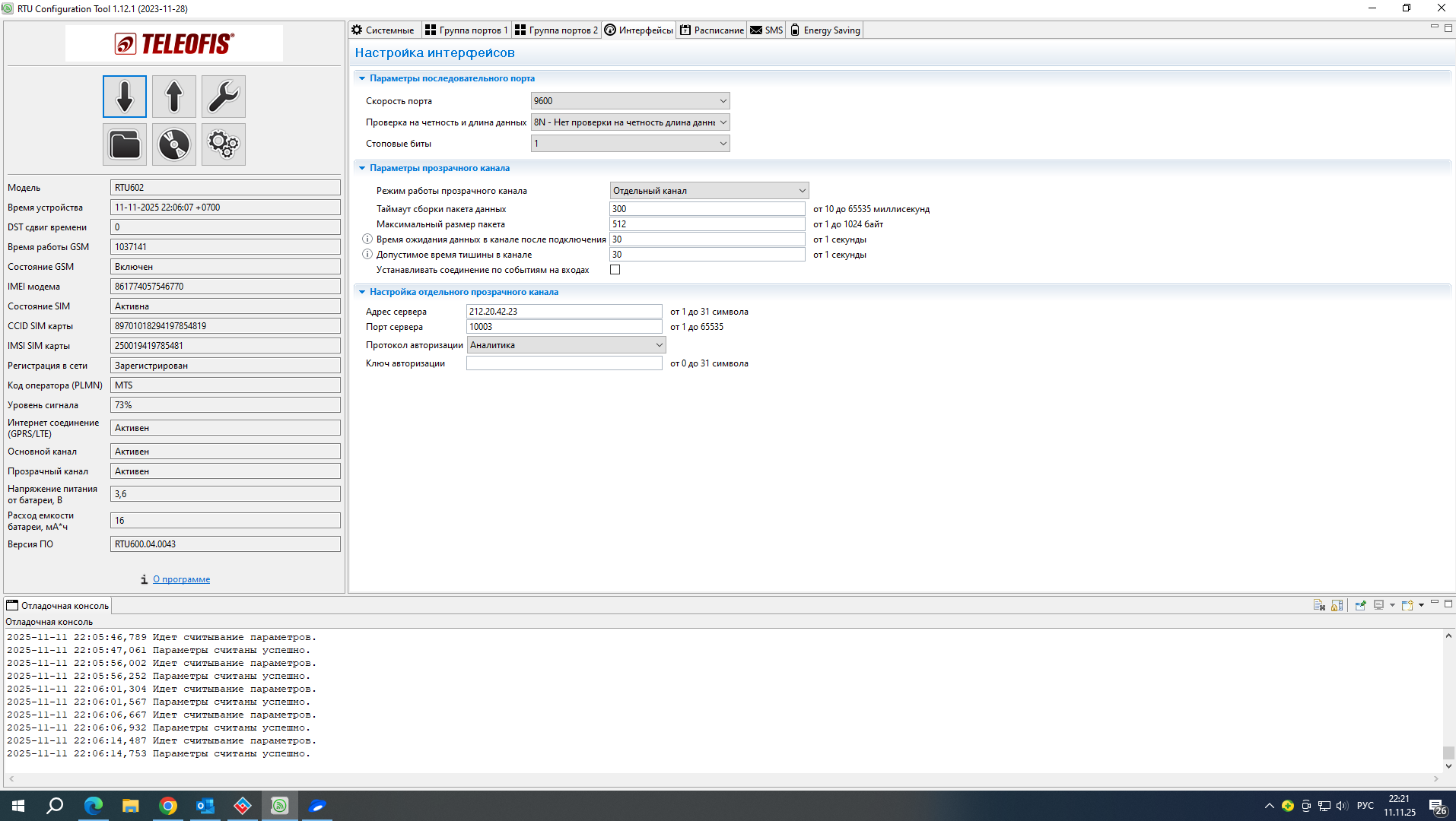 Добрый день! Необходимо настроить опрос данных с СПт941.10 по GPRS через rs232 Teleofis RTU602, сделал все настройки как в мануалах, а при опросе ответ не получен, пробовал отдельный канал без авторизации и протокол аналитика, в обоих случаях ответ не получен, на СПТ941 скорость порта 9600(пробовал 19200, безрезультатно). Подключение проводов согласно схеме из руководства по эксплуатации СПТ941.10. По CSD вычислитель опрашивается, на прямую к ПК тоже подключается. Teleofis RTU602 лэрс учет видит.