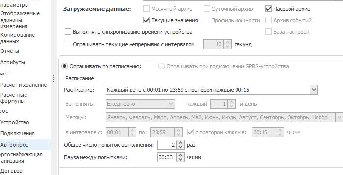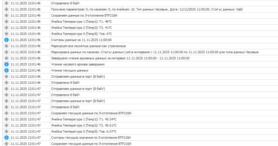 Далее только считывались данные в автоматическом режиме с настройкой Текущих и Часовых (предполагая, что Часовые считают архивные (5 минутные) данные с прибора.