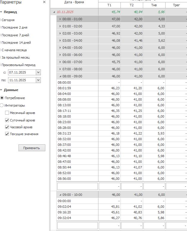 10/11/2025 до 9 часов я считал часовые данные, для точности архивные данные в ВТР 210И с интервалом фиксации каждые 5 минут через Часовой. И также в ручном режиме за предыдущие дни до 10/11/2025.